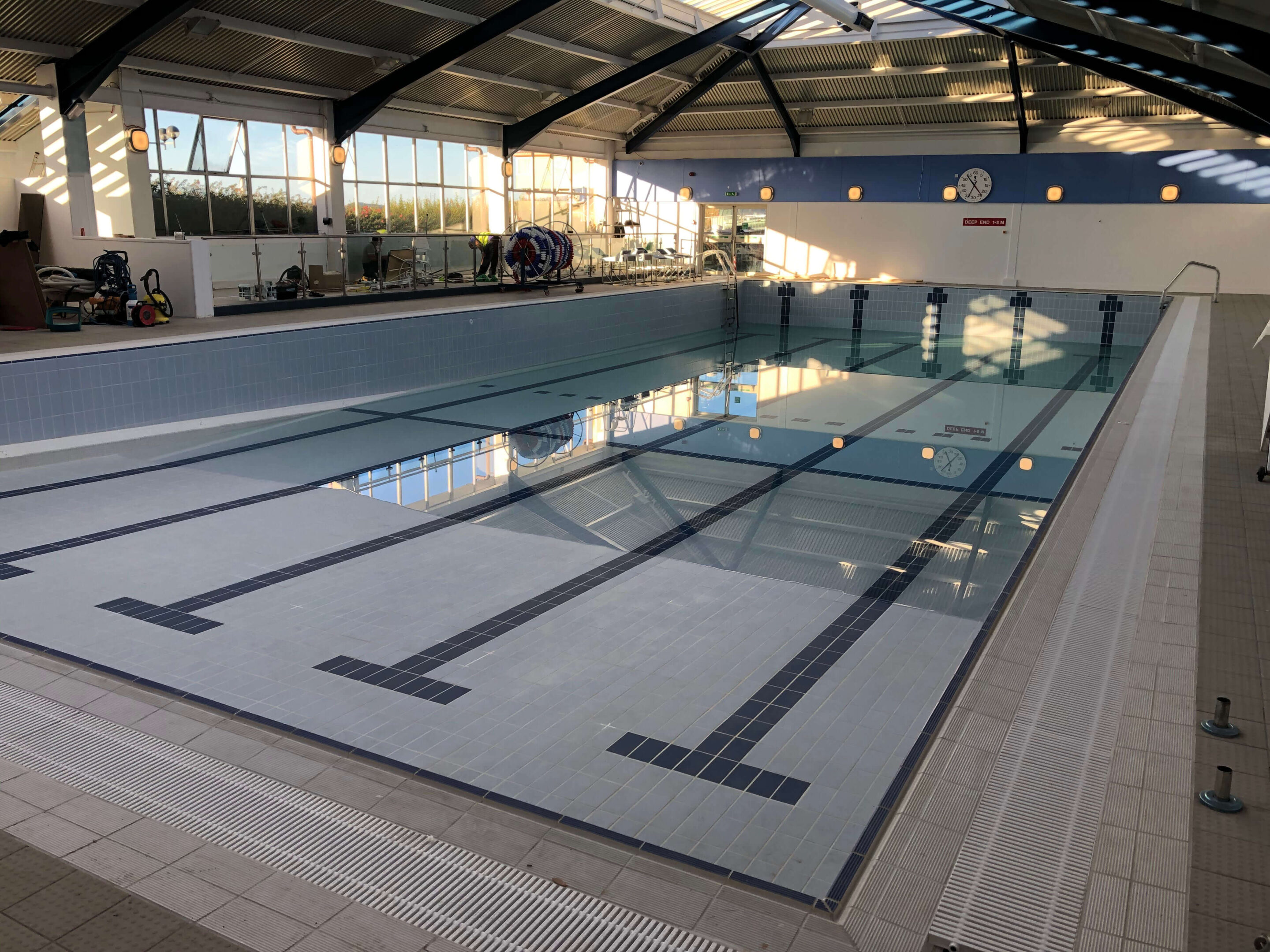 An entire brand-new pool base was laid out by Guncast to replace the original screed (the surface at the bottom of the swimming pool), which had become water damaged. Many of the tiles beneath the existing fibreglass of the 25m indoor pool were also in poor condition, requiring replacement.